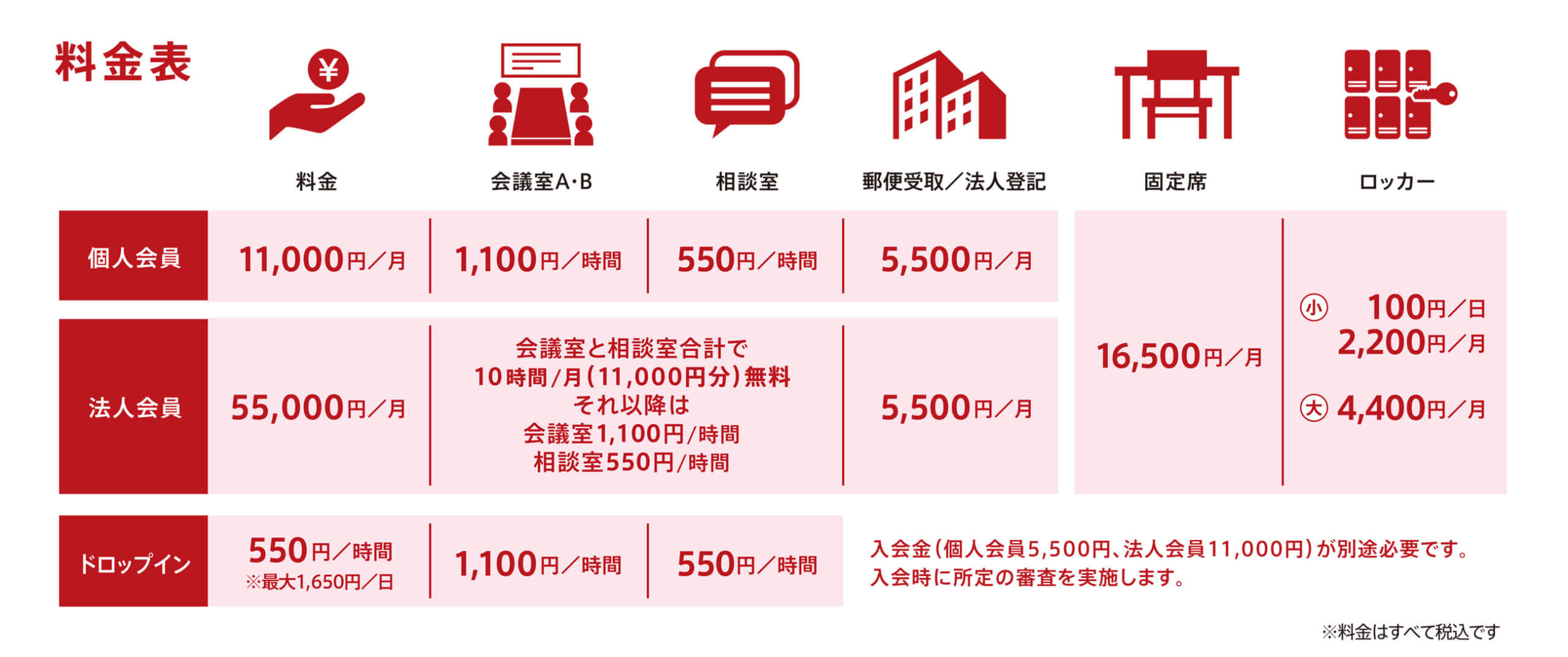 会員限定で、すべてのスペースと会議室を利用できます(固定席エリア・有料ロッカーを除く)。
